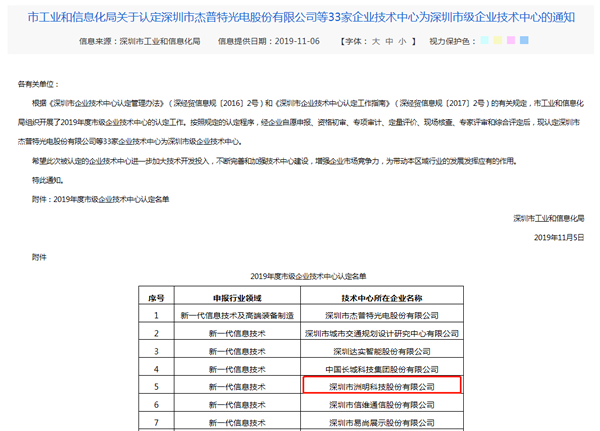 2019年11月7日,深圳市洲明科技股份有限公司被深圳市工業和信息化局認定為2019年度深圳市級企業技術中心。